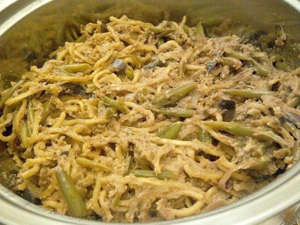 Calentar y cuando los fideos y las berenjenas estén tiernos, añadir las alubias cocidas y llevar a ebullición.