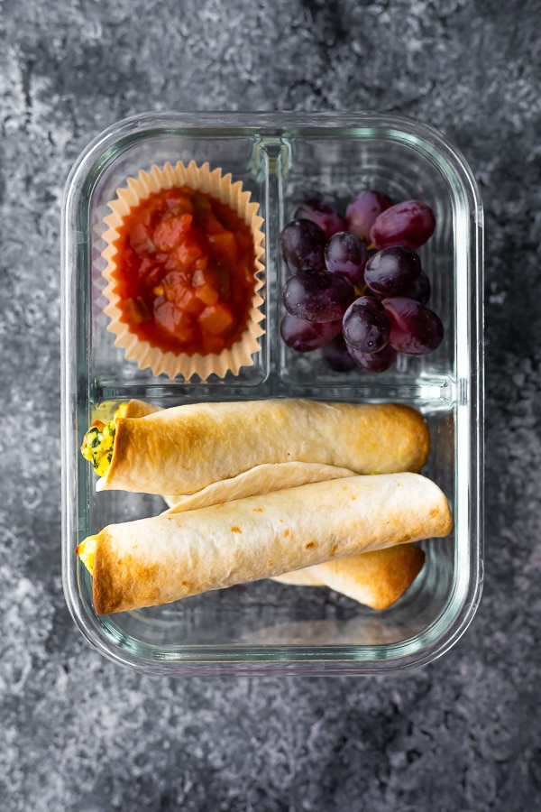 Taquitos de desayuno congelados rellenos de huevos revueltos, espinacas y queso feta. ¡Prepare un lote y suministre en el congelador!