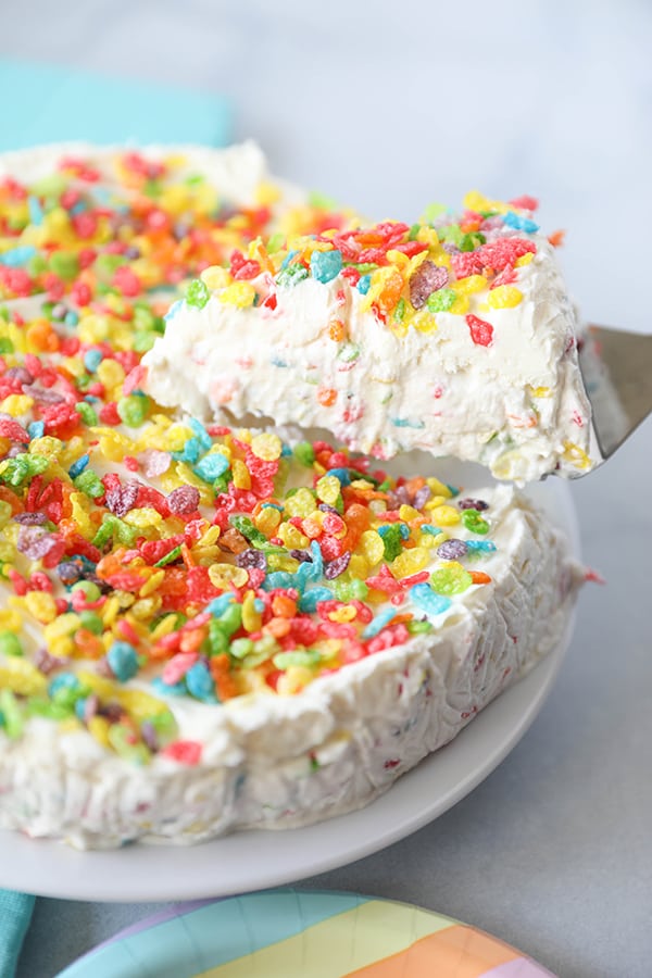 ES Tarta afrutada de gravilla y helado ¡Es divertido de hacer y divertido de comer! ¡Un cremoso helado casero con un toque colorido de cereal Fruity Pebbles y una capa de glaseado de vainilla es una excelente alternativa horneada sin gluten!