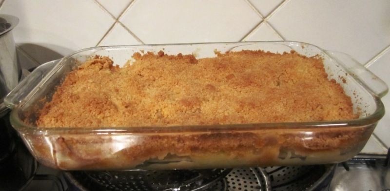 Hornear a 200°C durante 45 minutos o hasta que las manzanas estén bien cocidas y la cobertura esté crujiente.