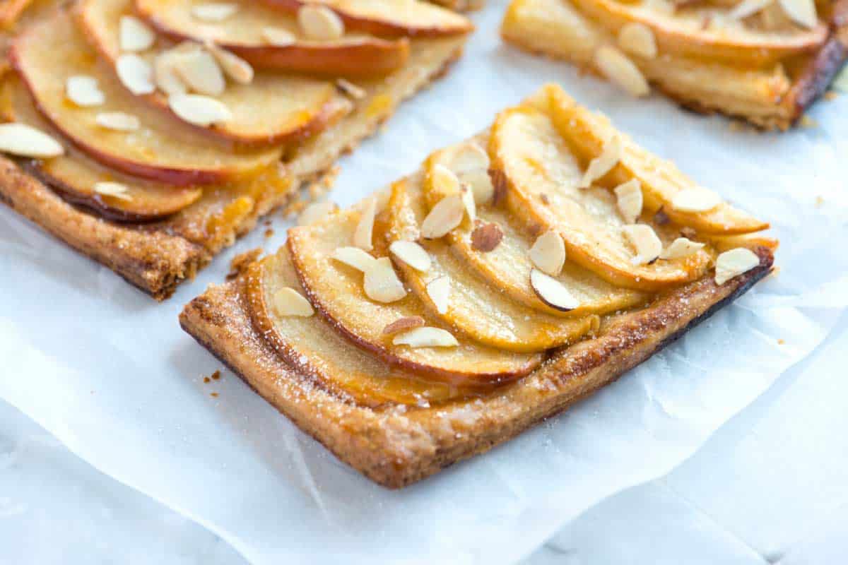No hay nada exigente aquí. Solo manzanas en rodajas finas alineadas en una corteza mantecosa y escamosa. Las manzanas se frotan ligeramente con mermelada de albaricoque y luego se cubren con un puñado de almendras en rodajas.. Nos encanta cómo queda, pero puedes omitir fácilmente la mermelada y hacer una hebra de salsa de caramelo. El azúcar en polvo también es bueno.