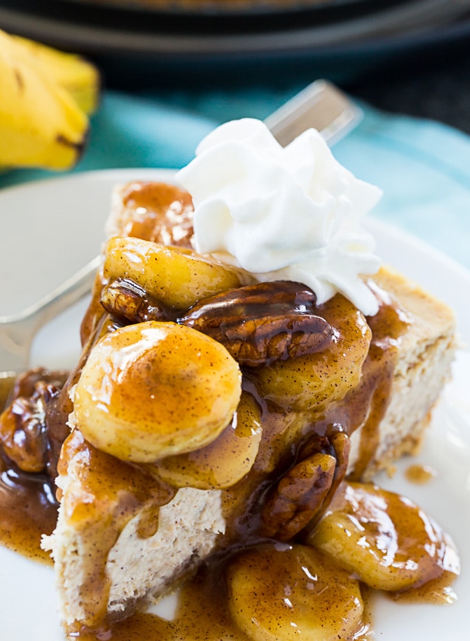 Bananas Foster Cheesecake tiene una corteza de oblea de vainilla, un glaseado cremoso de plátano y sabor a ron cubierto con una mezcla de plátano con rodajas de plátano y nueces. Es un pastel de queso maravilloso para una celebración de Mardi Gras o una fiesta temática de Nueva Orleans.