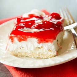 Con la excepción de los 15 minutos que necesita la corteza en el horno, el resto es una receta sin hornear, ¡ME ENCANTA para el verano! La corteza es una simple corteza de pan dulce que incluye nueces picadas; La textura de nuez es una base fantástica para la capa de queso crema endulzado. Se espolvorean más nueces picadas sobre el queso crema, luego se cubren con batidor fresco y relleno de pastel de cereza.