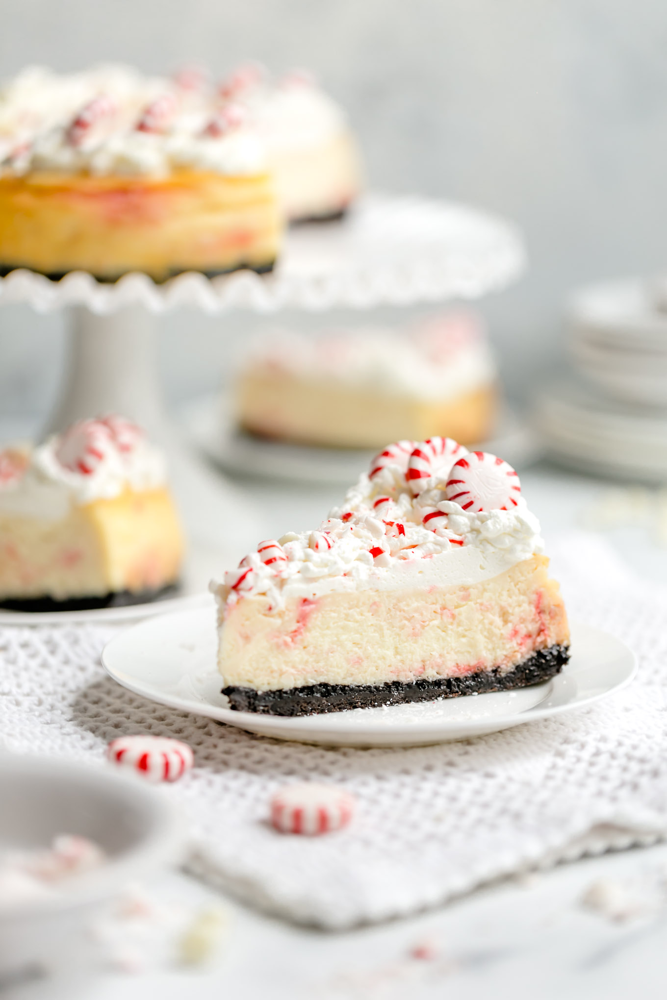 La tarta de queso siempre es un éxito navideño, pero se vuelve aún más festiva y especial cuando se introducen el chocolate blanco cálido y cremoso y la menta de invierno. El extracto de menta infunde la tarta de queso con la cantidad justa de menta para compensar el queso crema picante y mantener todo el pastel fresco y crujiente. Los bastones de caramelo o las mentas agregan un crujido rojo y blanco cada vez.
