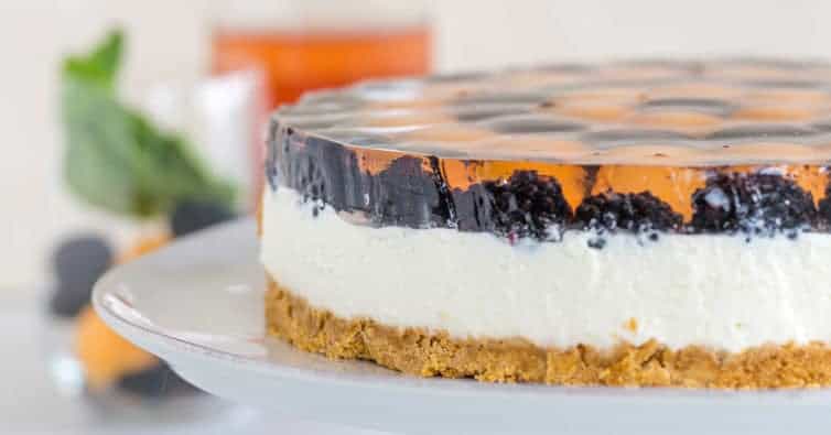Un relleno de pastel de queso crudo con infusión de rosas se apila sobre la corteza de galleta graham más fina (¡incluso cruda!), Cubierto con melón y moras que se colocan, ¿estás listo? – ¡una gelatina rosa! Básicamente es cheesecake rosa con mermelada de adulto. ¡Es hermoso y delicioso, y las posibles personalizaciones que puedes hacerle son infinitas!