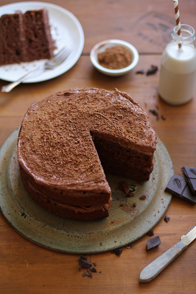 Coloque uno de los pasteles en un plato para servir y espolvoree el glaseado de chocolate encima. Coloque el segundo pastel encima y congélelo con el glaseado restante. Si lo desea, ralle una barra de chocolate sobre el glaseado para lograr un efecto elegante. ¡Corta rebanadas grandes y disfruta!
