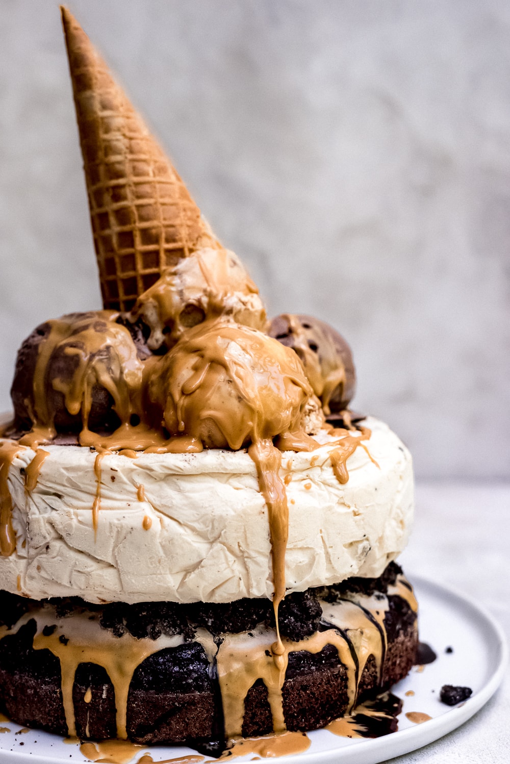 Comenzamos con una base de pastel de chocolate húmedo que se cubre con mantequilla de maní, chocolate para untar y trozos de sándwich de chocolate para el crujido. Esto se complementa con mi receta favorita de helado de mantequilla de maní, que relleno con tazas de sándwiches de mantequilla de maní con chocolate y mantequilla de maní. Para rematar, terminamos con helado de chocolate con mantequilla de maní, bombones de chocolate y mantequilla de maní, y un cucurucho de helado, por supuesto.