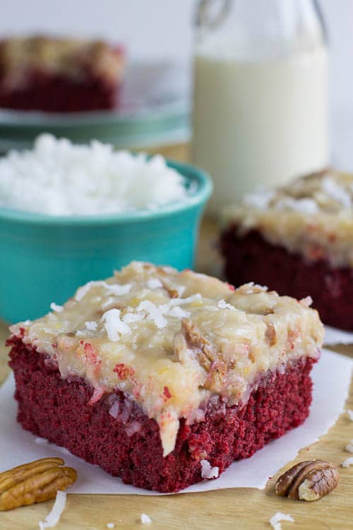 Este pastel es una combinación de dos de mis pasteles sureños favoritos: Red Velvet Cake y German Chocolate Cake. La masa del pastel es Red Velvet con su color rojo brillante y su ligero sabor a cacao en polvo. El glaseado espeso y rico es chocolate alemán puro con coco y nueces.