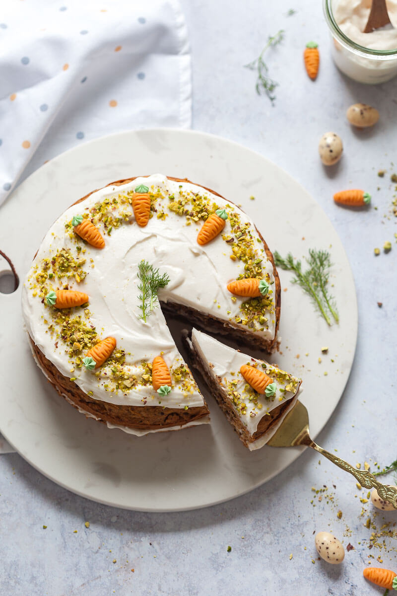 - Decora el pastel a tu gusto. Usamos pistachos troceados y zanahorias de mazapán decorativas. ¡Las nueces pecanas también funcionan!