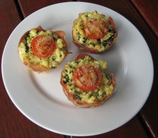 Cubre el fondo y los lados del molde para muffins con tiras de jamón.