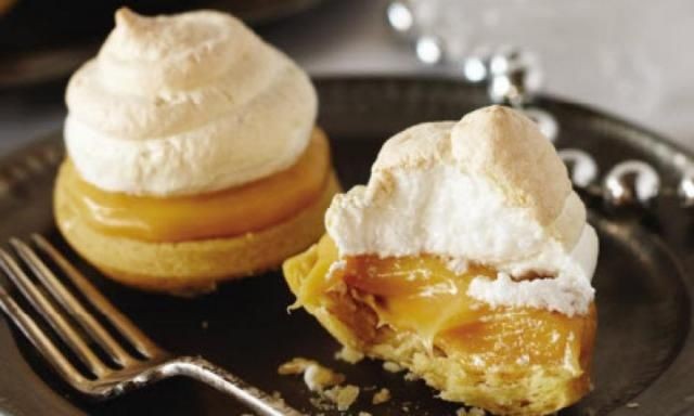 En un tazón grande y limpio, bata las claras de huevo con una batidora eléctrica hasta que se formen picos suaves. Poco a poco agregue el azúcar, mezclando bien, hasta que el merengue esté espeso y brillante. Usando una bolsa de plástico con una boquilla redonda de 2 cm, coloque el merengue sobre las tartas de caramelo y cocine durante 6-8 minutos, hasta que estén doradas.