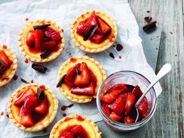 Cubra los pasteles con fresas y almíbar. servir inmediatamente