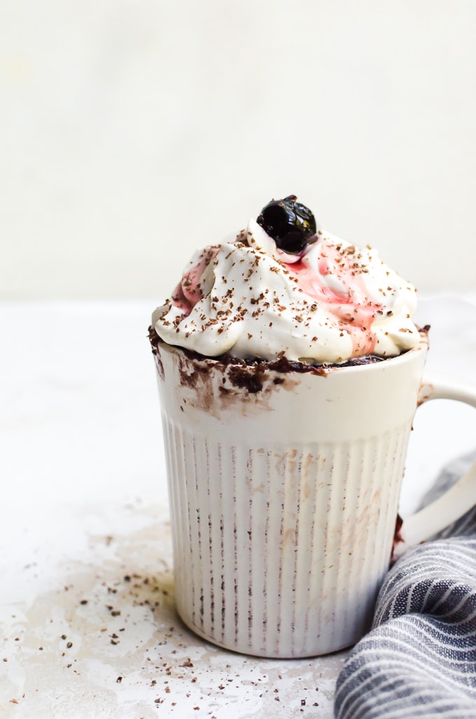 Me encanta la idea de los brownies y tortas hechas en la taza. Es una forma realmente divertida y asequible de hacer un regalo sin pasar demasiado tiempo en la cocina y sin tener incorporado el control de porciones. A mi hijo le encanta y le encanta cuando los hacemos para la noche de cine. Este brownie de taza de la selva negra es uno de nuestros favoritos absolutos, y no toco la bocina, pero también ganó un premio con la Asociación Estadounidense de Lácteos (Noreste) cuando fui de gira con ellos en octubre de 2018.