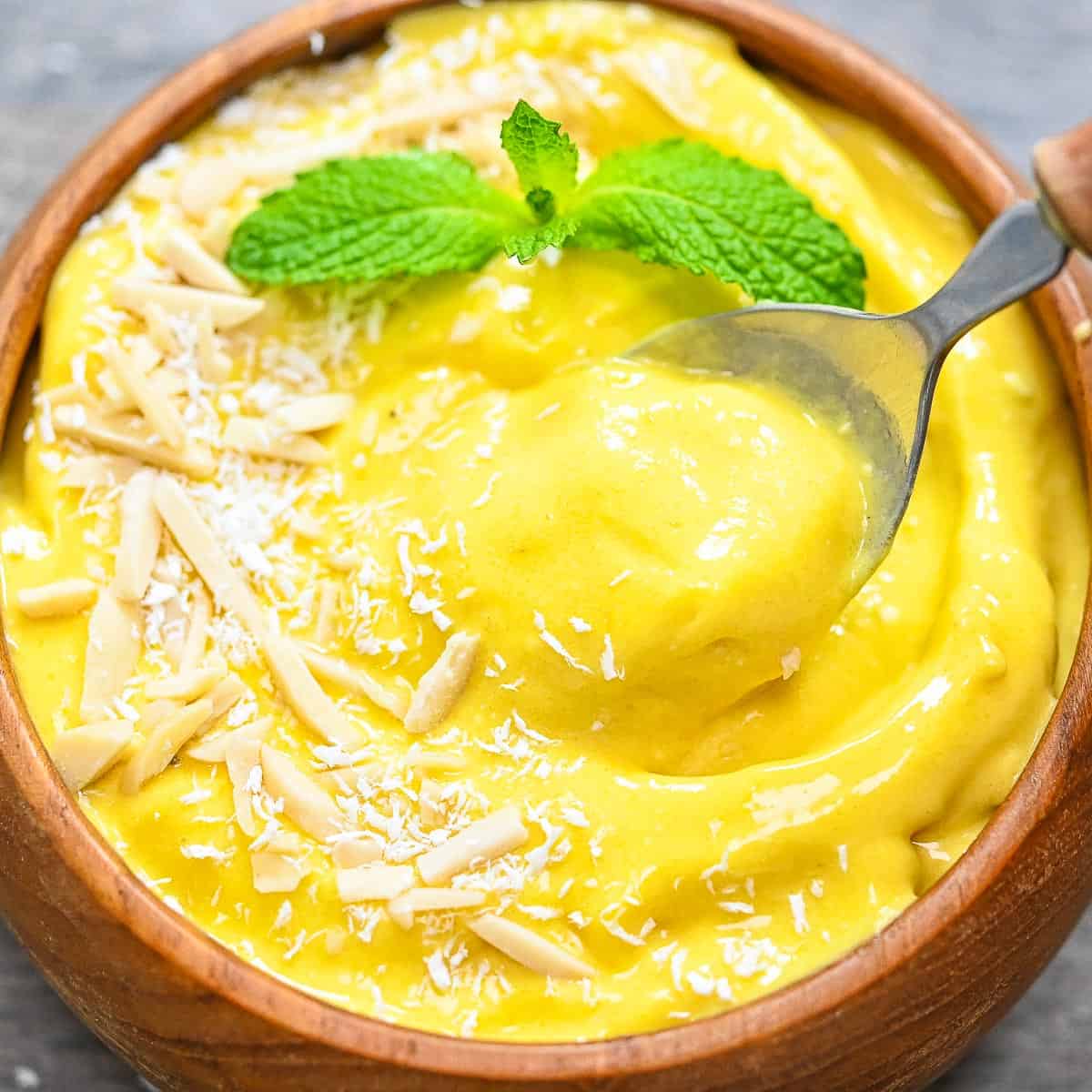 Éste tazón de batido de mango es espeso, suave y cremoso. Hecho con tres ingredientes simples, este delicioso desayuno se puede servir con sus ingredientes favoritos para comenzar el día de manera fantástica.