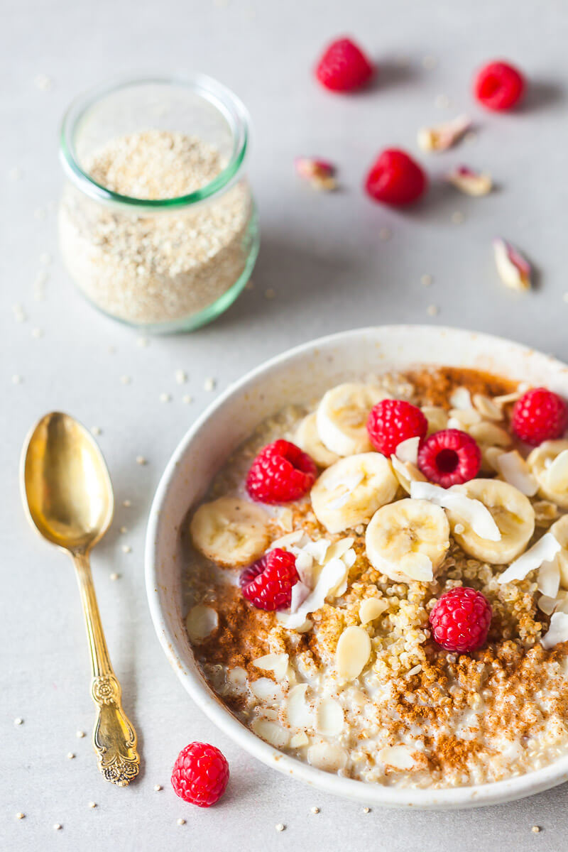 - En un bowl, poner 4 cucharadas de quinua cocida, agregar alrededor de una taza de leche de almendras (fría o caliente), espolvorear con canela, agregar las rodajas de plátano, las almendras, las hojuelas de coco y algunas frambuesas. Atender.
