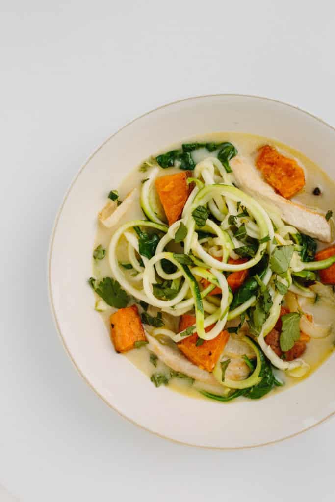 Tazón de pollo con jengibre y coco con fideos de calabacín