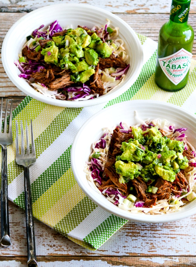 Realmente me encantaron estos tazones de pimientos verdes y col rizada, y pensé que la carne estaba lo suficientemente picante como para ser interesante. La carne deshebrada también se puede servir en tortillas bajas en carbohidratos o arroz de coliflor para las personas a las que no les gusta la col rizada. La receta tiene algunos carbohidratos, pero recuerda que la información nutricional es para toda la comida. Y creo que la salsa de aguacate es opcional si quieres un poco menos de carbohidratos, pero nunca me la saltaría; ¡La sabrosa salsa de aguacate lo hace realmente increíble!