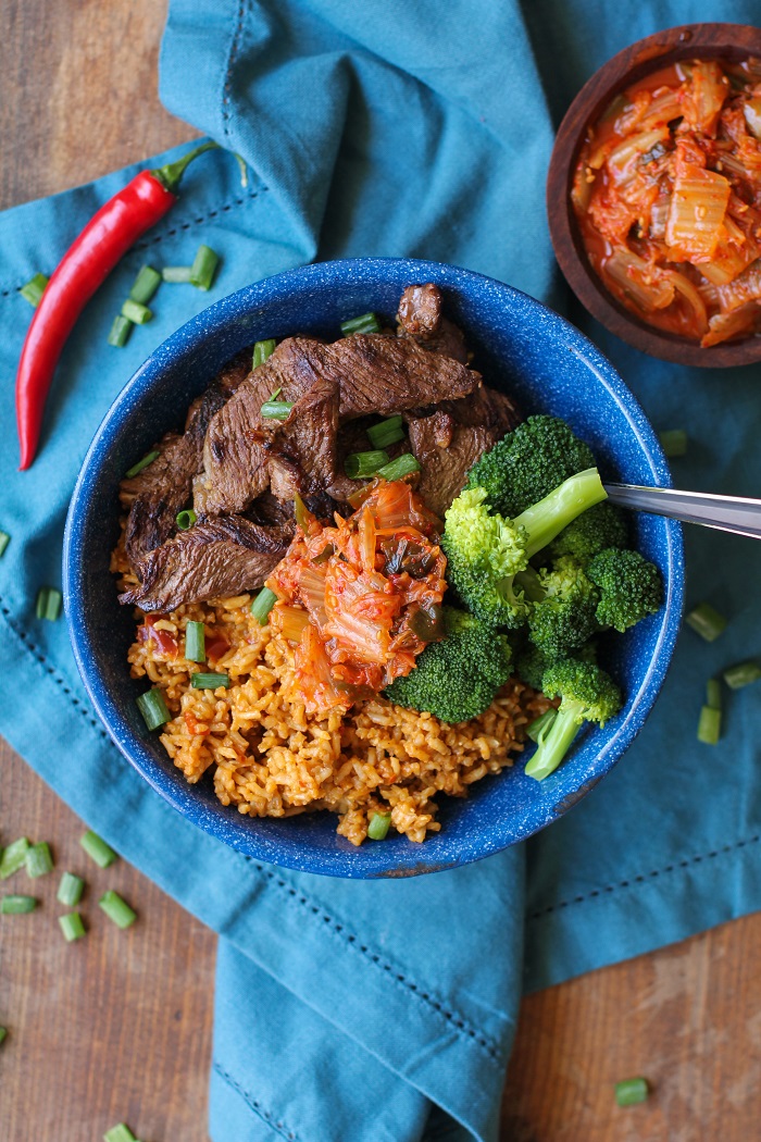 Para estos tazones, hice brotes de Lundberg de arroz tostado coreano, bulgogi y brócoli al vapor. Simplemente vertí todo en los tazones y serví con el kimchi comprado en la tienda.