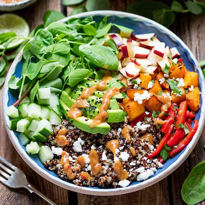 Estos tazones vegetarianos de Buda con salsa picante de maní son una excelente ensalada de invierno para esos días en los que anhelas algo un poco más ligero para la cena.