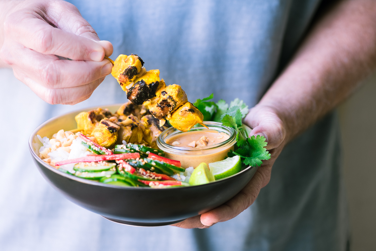 Pollo marinado con especias de Indonesia, luego ensartado, asado a la parrilla y servido con arroz jazmín con una rica salsa de soya y maní. ¿Se ve exótico? Es sólo miércoles por la noche para la cena para nosotros. Esto se debe a que, si bien los tazones satay de pollo tailandeses requieren algunos pasos para prepararse, la mayoría de ellos se pueden preparar en la mañana o el día anterior, lo que lo hace muy conveniente para cualquier día de la semana.