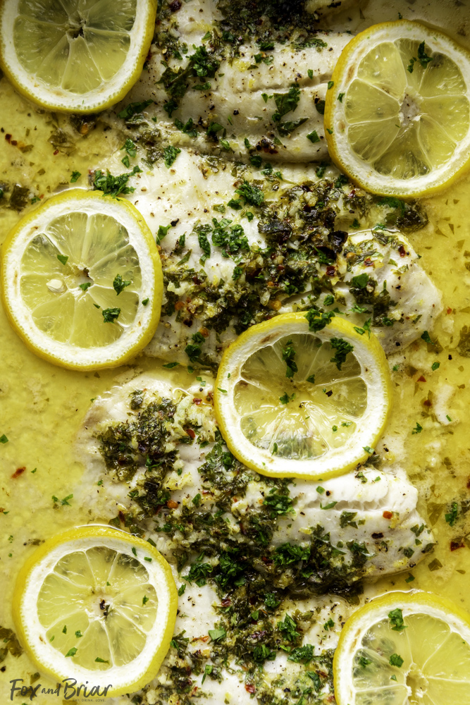 Me encanta esta tilapia horneada con mantequilla de limón porque es muy rápida y fácil, ¡pero llena de sabor! La tilapia es un pescado blanco delicado, por lo que necesita un poco de ayuda en el departamento de sabor. ¡Mantequilla, ajo y limón al rescate! La mantequilla de limón es un sabor clásico a pescado y funciona perfectamente aquí con ajo, perejil y una pizca de pimiento rojo. Agregué el sabor a limón con jugo y ralladura de limón junto con rodajas de limón. Una simple salsa de limón, mantequilla y ajo tarda solo unos minutos en prepararse. Luego, los filetes de tilapia se sumergen en salsa de limón y se hornean rápidamente en el horno.