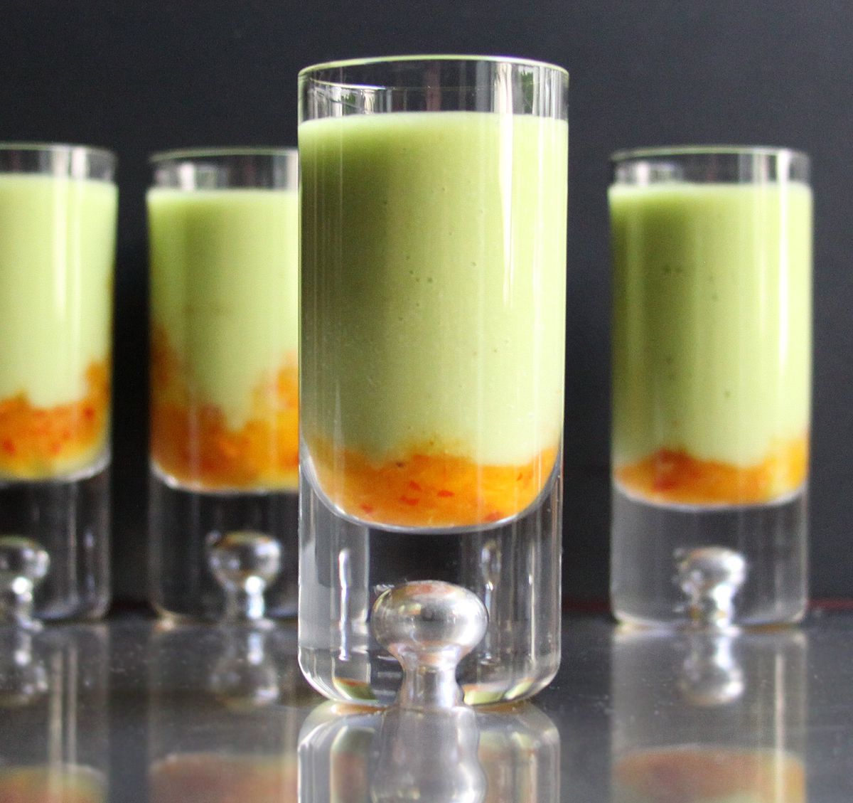 Estos tiradores de sopa fría se disfrutan en dos sorbos. El primero en apreciar la sutil pero sabrosa y sedosa sopa de aguacate. El segundo para terminar un sorbo con un potente ponche de naranja, pimienta y ajo. Despierte su paleta y es una forma divertida y animada de comenzar su comida o celebración. Excelente como aperitivo o como aperitivo. – pruebalo