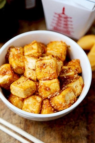 ¡Una receta de tofu crujiente que sabe a chino! Sumergidos en una salsa de miel de sriracha dulce y picante, ¡estos cubos de tofu son deliciosos y están listos en solo 15 minutos!