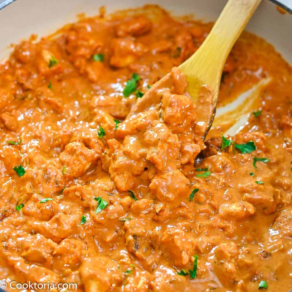 Este sabroso plato combina mejor con naan caliente o arroz basmati. También lo puedes servir con pan rústico, encima de pasta o incluso encima de tallarines de calabacín (“zoodles”).