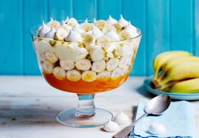 Justo antes de servir, pele y rebane los plátanos restantes. Poner los merengues pequeños y las rodajas de plátano sobre el bizcocho. Espolvorear con la fruta de la pasión reservada. Atender.