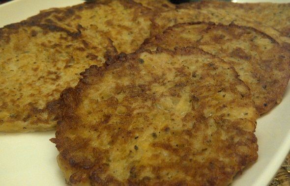 Calentar el aceite en una sartén y hacer las tortitas. Freír lentamente para que las tortitas queden bien cocidas y bien hechas.