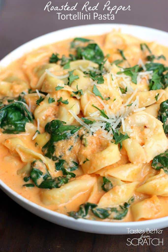 El tortellini de pimiento asado en salsa de crema roja es una cena entre semana para toda la familia.