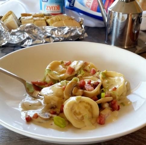Salsa: Calienta el aceite en una sartén, agrega el tocino y fríe hasta que esté bien cocido. Reserva un poco para decorar. Añadir los puerros, el ajo y los champiñones (añadir un poco más de aceite si hace falta), freír hasta que estén cocidos y añadir la nata (no hervir). Para servir, divida los tortellini en 4 tazones, vierta sobre la salsa, espolvoree con los trocitos de tocino reservados.