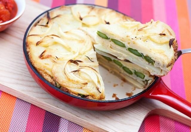 Usando una sartén de 18-20 cm de diámetro, coloque la mitad de las rodajas de patata cocidas en la sartén. Agregue la mitad de la mezcla de cebolla en una capa y coloque los espárragos en una sola capa encima. Cubra con la papa restante y luego con la cebolla restante.