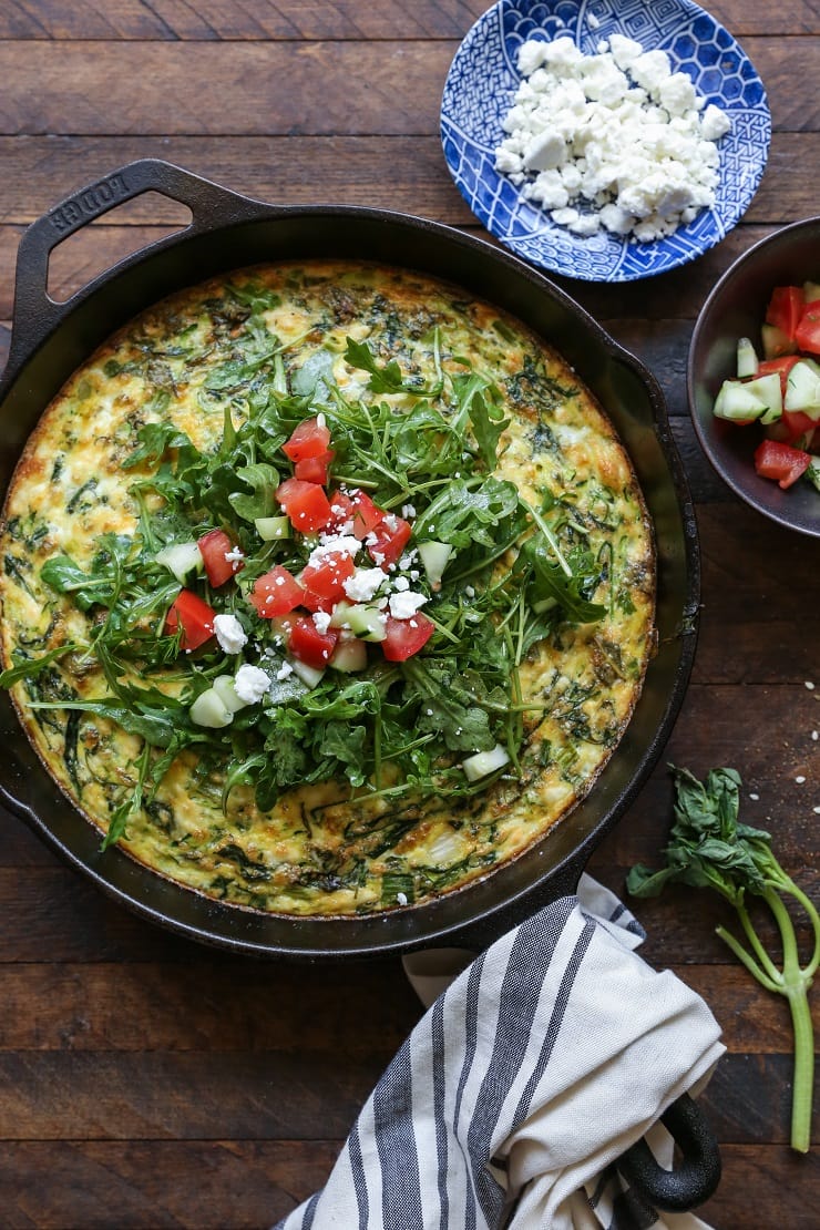Una tortilla saludable y rica en vegetales con calabacín, rúcula y queso feta. ¡Fácil de hacer y delicioso!