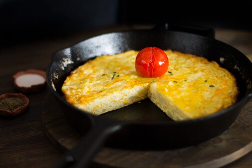 - Caliente el aceite en una sartén de hierro fundido de 6 u 8 pulgadas o una sartén antiadherente resistente al horno a fuego medio. Agregue la mezcla de huevo de coliflor y distribuya el relleno de manera uniforme. Cocine hasta que el fondo esté dorado, unos 5 minutos. Transfiera la sartén al horno y cocine hasta que la tortilla esté lista, aproximadamente 10 minutos. Retire del horno y deje reposar durante 5 minutos para terminar de cocinar.