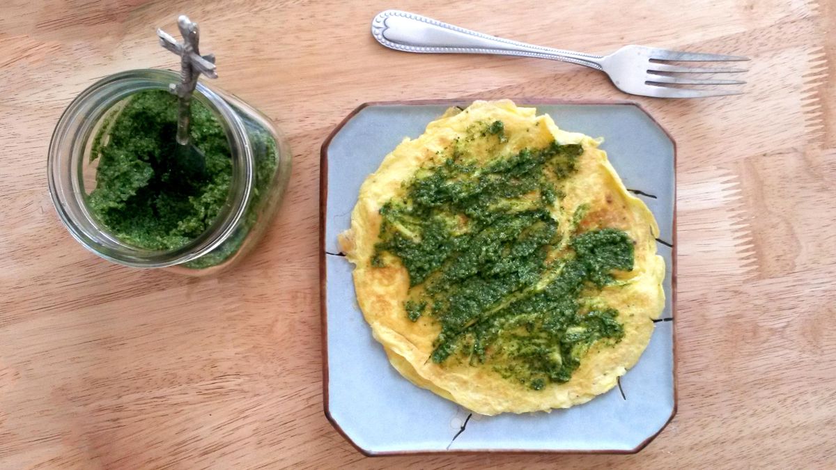 Este plato también quedaría delicioso servido con unos tomates frescos, o quizás con una pequeña ensalada de verduras mezclada con un chorrito de aceite de oliva y vinagre balsámico. O bien, renuncie a la tortilla por completo (¡buuu, silbido!) y unte el pesto en una buena rebanada de pan integral.