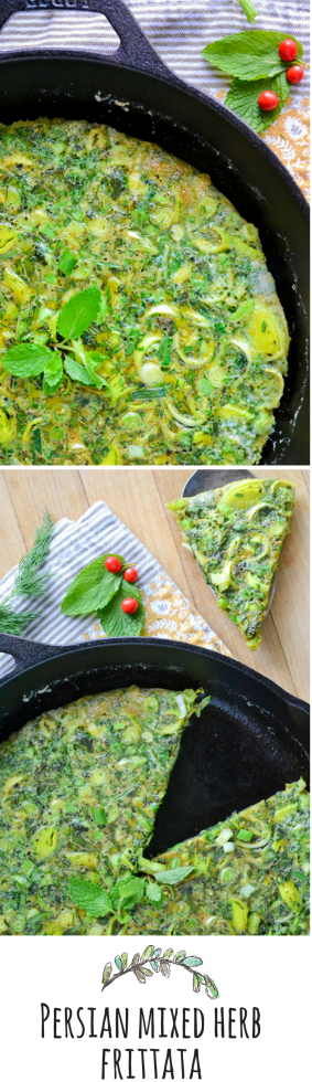 La tortilla persa de hierbas mixtas (Kuku Sabzi) es un plato tradicional de huevo de Oriente Medio que está literalmente cargado de hierbas frescas.