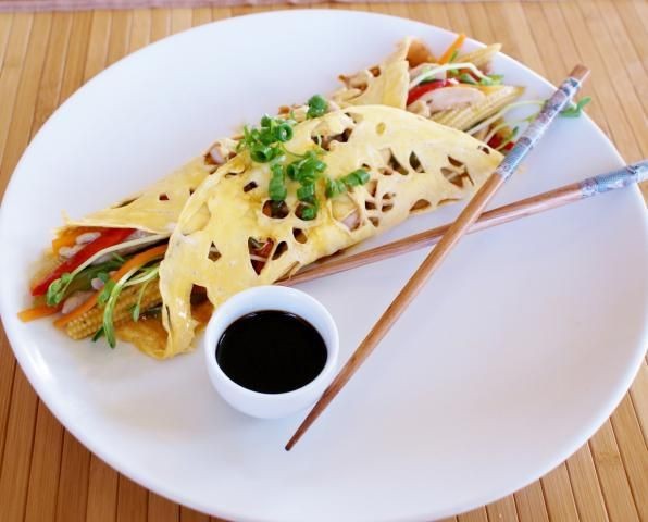Corte un pequeño agujero en la esquina de la bolsa con cremallera, agregue la mezcla de huevo a la sartén caliente, formando un patrón calado. Cuando esté cocido, dé vuelta en un plato para servir, de arriba hacia abajo, rellene con una mezcla de pollo frito y doble los bordes para sellar el relleno.