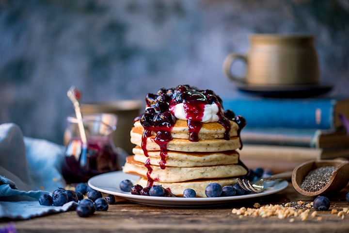Receta de panqueques de avellana y chía con compota de arándanos: