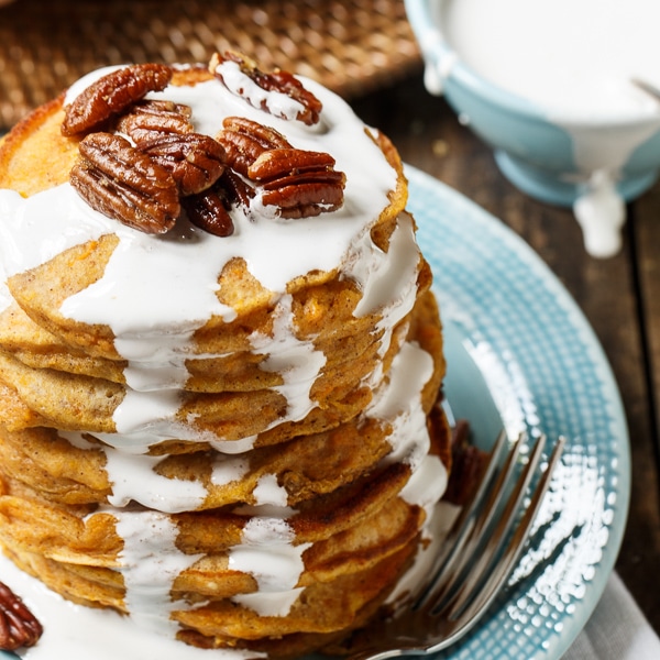 A medida que se acerca septiembre, todo en lo que puedo pensar es en manzanas, calabazas y batatas. Las tortitas de camote con nueces confitadas y salsa de malvavisco son solo el desayuno para ese otoño acogedor. Son como la versión de panqueques de la cazuela de camote.