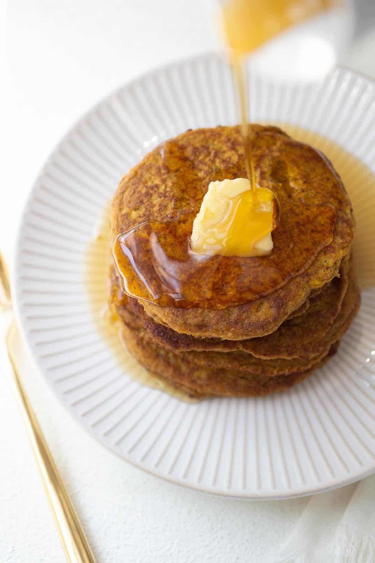 ¡Hemos estado haciendo estos panqueques de calabaza saludables durante años y son uno de nuestros desayunos de otoño favoritos! Me encanta que no contengan gluten ni lácteos y que estén hechos con ingredientes integrales como avena molida en lugar de harina.