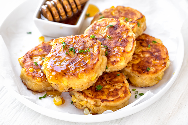 - Termina las tortas de elote con una pizca de sal y decora con cebollín picado; Sirva solo o con un glaseado extra de miel encima, o tal vez un poco de crema agria con cebollino.