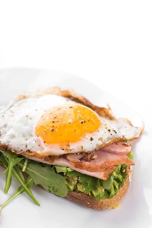 Si bien la tostada de aguacate por sí sola es perfectamente deliciosa, me encanta cubrirla con hojas de rúcula especiadas, jamón ahumado en rodajas gruesas y un huevo frito líquido.