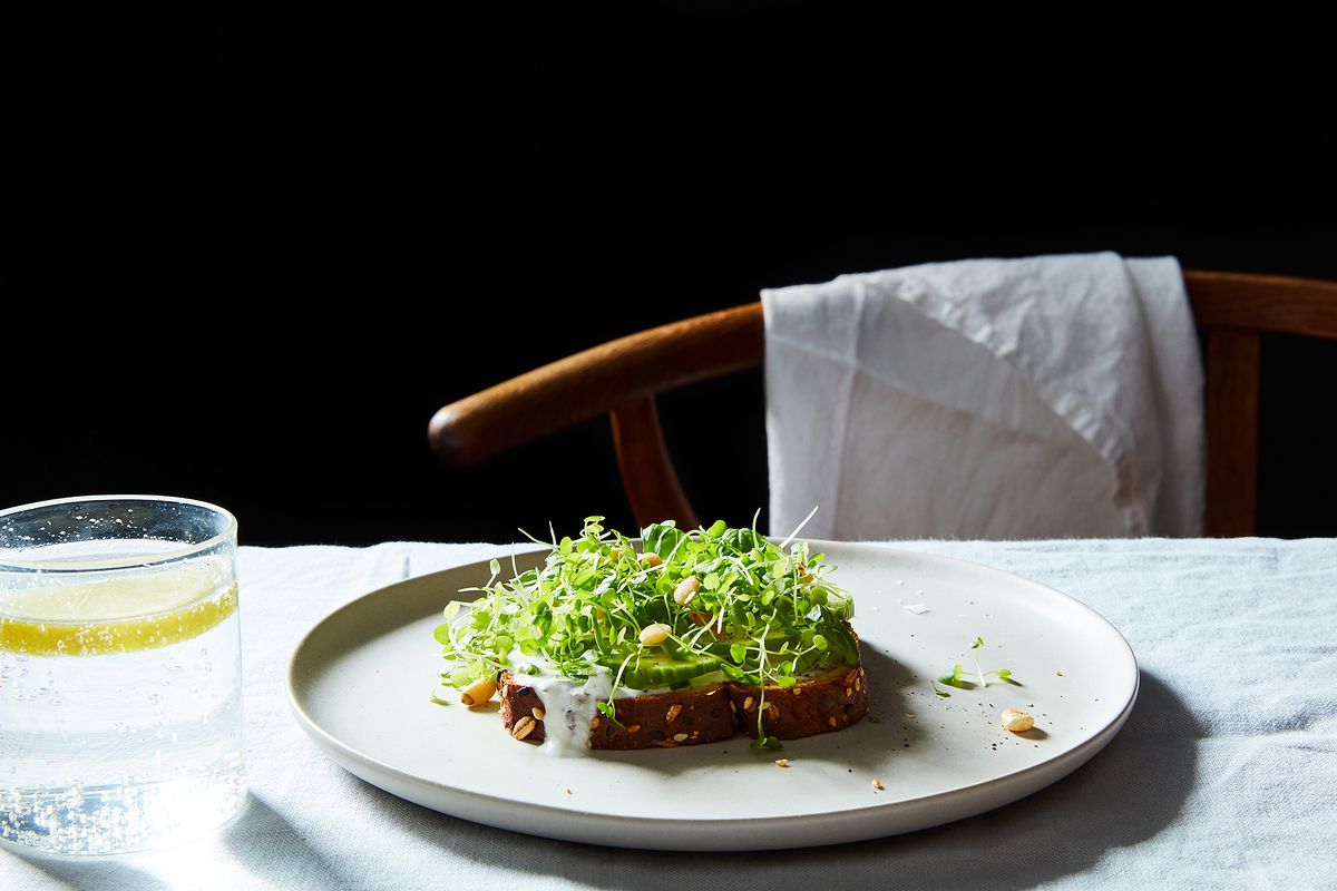 Extienda sobre una tostada, agregue rodajas de pepino, microgreens, piñones y albahaca picada.