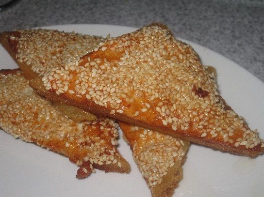 Retire las cortezas del pan, córtelas en diagonal, extienda la mezcla en un lado del pan y sumerja el pan, con la mezcla hacia abajo, en las semillas de sésamo.