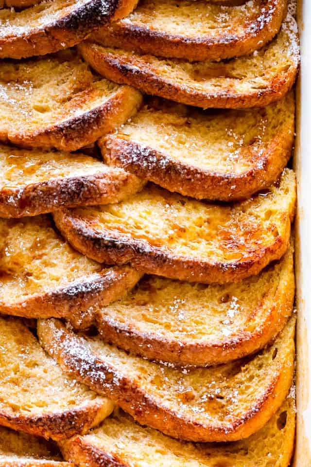 Sin embargo, si necesita prepararlo la mañana del DI, simplemente prepare todo y déjelo reposar durante unos 20 minutos antes de cocinarlo. La tostada francesa al horno es perfecta para un desayuno sin esfuerzo, pero también para un desayuno de fin de semana con la familia.