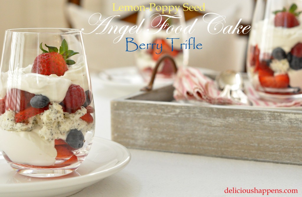 - Arregle el fondo de 6 copas de vino sin tallo con rodajas de frambuesas, arándanos y fresas. Luego agregue una capa de pedazos de pastel de ángel en rodajas o desmenuzados con semillas de amapola de limón encima de la fruta.