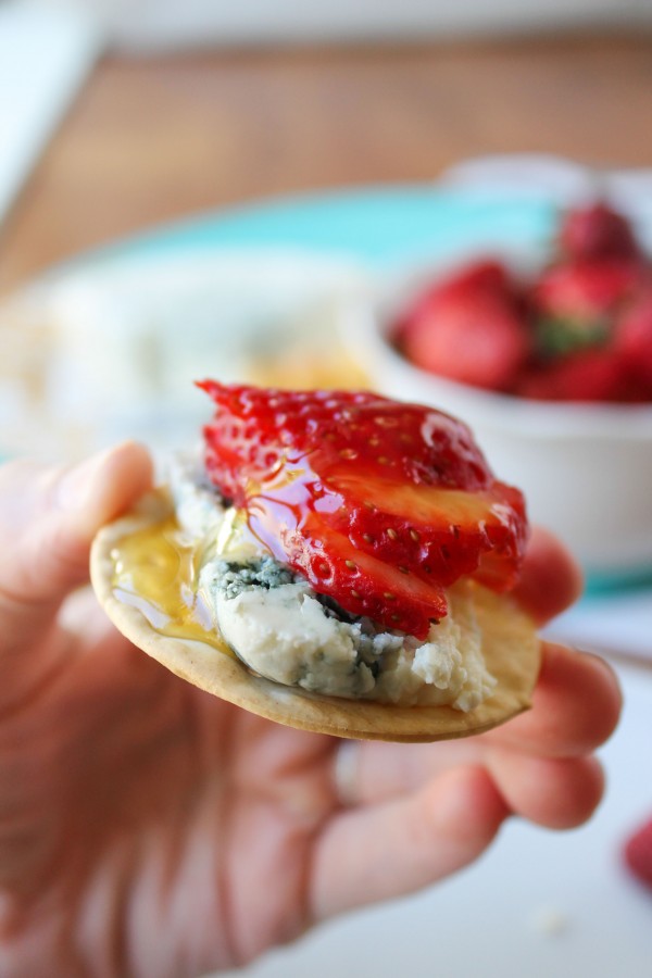 Esta es una gran comida de fiesta porque ni siquiera tienes que hacer nada. Está bien, creo que corté las fresas, pero puedes hacerlo con anticipación. Luego deja que los invitados armen su combo de galleta, gorgonzola, fresa y miel. O pruebe las uvas y el queso de cabra. O melocotones y queso brie. O pera y gorgonzola. ¡Si combinar mi ropa fuera tan fácil como combinar frutas y queso!