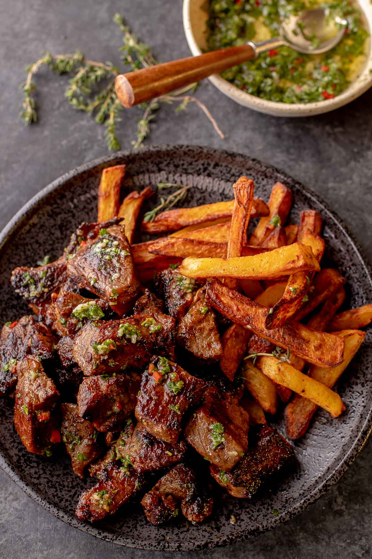 Bocaditos jugosos de filete ¡Están chamuscados a la perfección crujiente en una sartén de hierro fundido para ese aperitivo rápido o cena que siempre es un éxito! salsa chimichurri agregue un agradable sabor a ajo para llevar esos bocados carnosos a la parte superior.