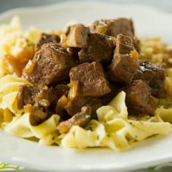 Trozos de carne a fuego lento con setas y fideos de huevo